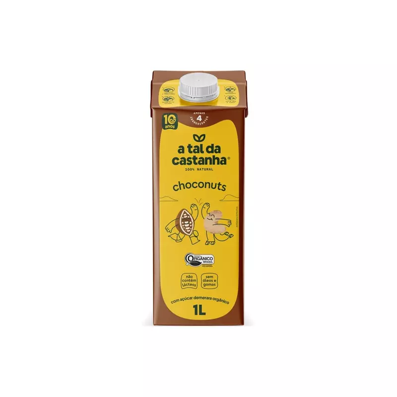 Achocolatado Choconuts é uma bebida vegetal produzida por A Tal da Castanha, elaborada com base em castanhas de caju e cacau em pó, adoçada com açúcar demerara orgânico. É uma bebida nutritiva e saborosa, 100% vegetal, livre de glúten, soja ou conservantes, e rica em ômega 9.