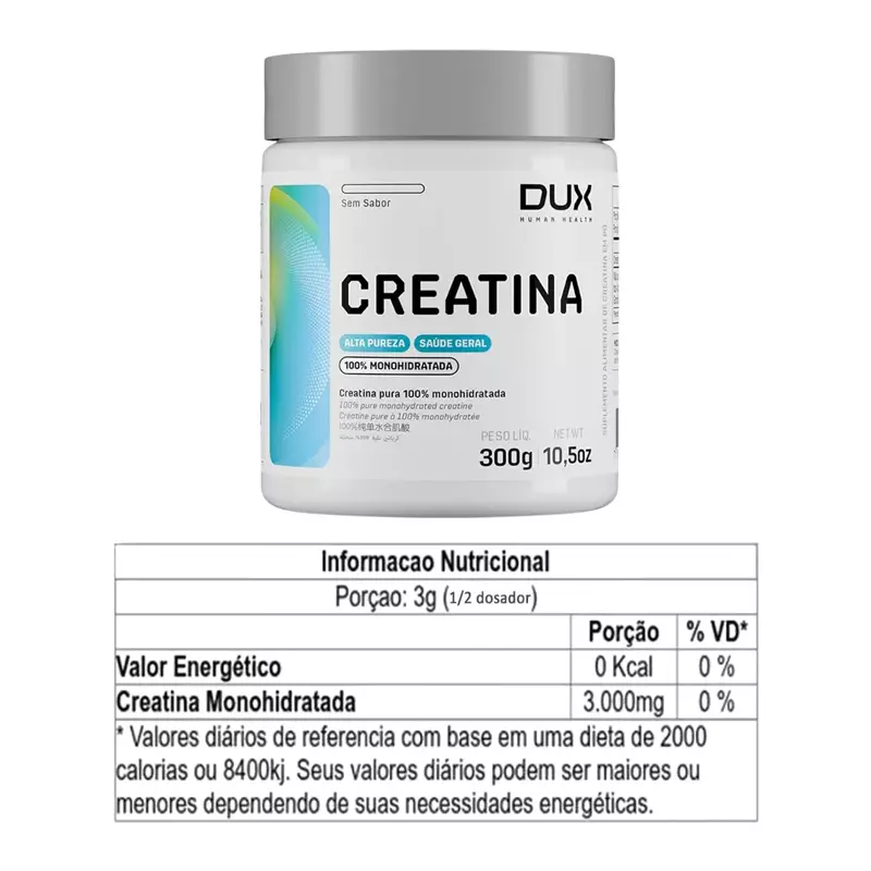 - 【CREATINA 100% MONOHIDRATADA】A Creatina Monohidratada da DUX Human Health é 100% pura e não contém aditivos. Sua fórmula garante máxima absorção e eficácia, ideal para quem busca ganho de força e massa muscular.