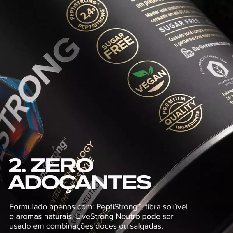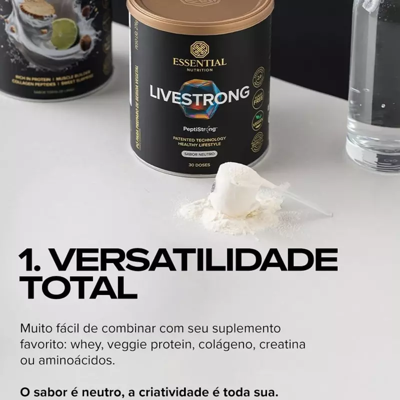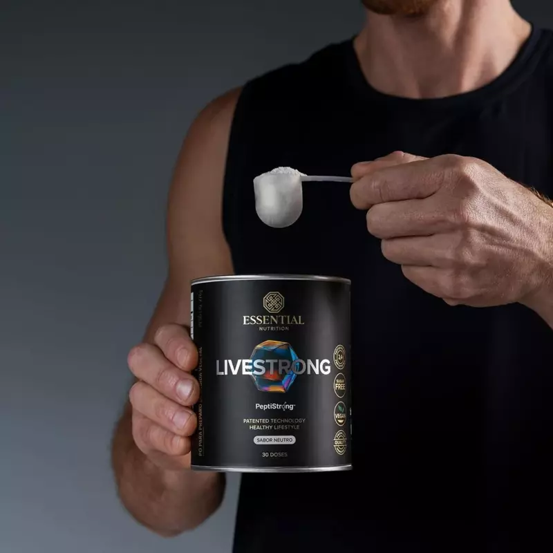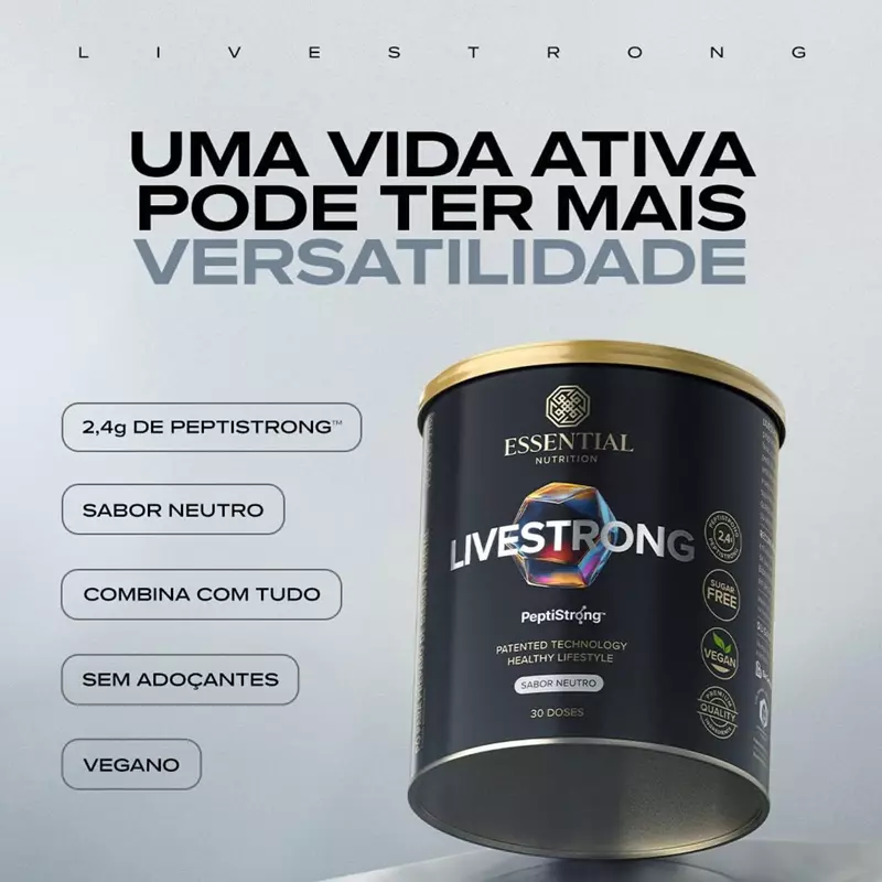 O Livestrong Neutro 276g da Essential Nutrition, é um suplemento alimentar vegano em pó com sabor chocolate, desenvolvido pela Essential Nutrition. Ele se destaca por sua fórmula que combina puro cacau com o ingrediente inovador PeptiStrong.
