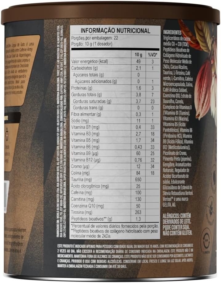 Triglicerídeos de cadeia média C8 + CIO (TCM), Peptídeos Bioativos de Colágeno Hidrolisado de Peso Molecular Médio de 2kDa, Cacau Alcalino, Taurina, L-Tirosina, Cafe verde, L-Carnitina, Cafeńna Microencapsulada, Colina, Café Arábica Solúvel, Coenzima Q10, Extrato de Baunilha, Canela, Complexo de Vitaminas B (Vitamina B1 (Tamina), Vitamina B3 (Niacina), Vitamina B5 (Acido Pantotênico), Vitamina B6 (Piridoxina HCI), Vitamina B9 (Acido Fólico), Vitamina B12 (Metilcobalamina), Picolinato de Cromo, Pimenta Preta (piperina), Gengibre, Aromatizantes Naturais, Regulador de Acidez Bicarbonato de sódio, Edulcorante, Glicosfdeos de Esteviol de Stevia Rebaudiana Bertonk Verisol é uma marca GELITA AG.