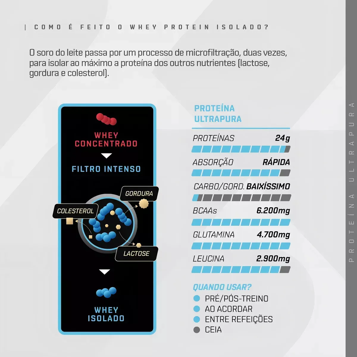 O whey protein isolado possui um perfil nutricional completo, ideal para ser consumido pré/pós treinos. Contém 24g de proteína, 100% pura, extraída diretamente do soro do leite, e duplamente filtrada, sem blend ou adição de outras proteínas. Apresenta um perfil nutricional rico em aminoácidos, incluindo 2,7g de leucina, 2,5g de glutamina, uma combinação importante para a construção muscular e recuperação acelerada.